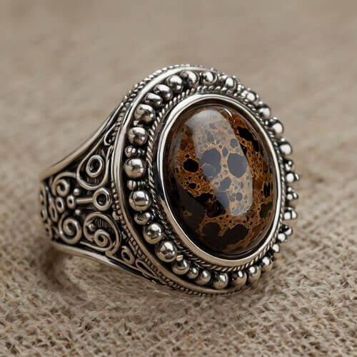 Particulièrement prisée pour ses motifs naturels, elle est souvent taillée en cabochon pour sublimer le fossile. On la retrouve dans des pendentifs, bagues et bracelets, montés généralement en argent vieilli ou bronze pour accentuer son charme rustique.
